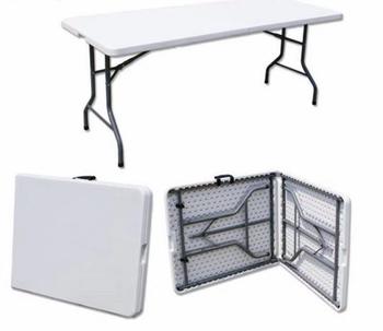4ft 6ft HDPE สี่เหลี่ยมผืนผ้าสีขาวพับครึ่งพลาสติกด้านบนพร้อมขาเหล็กพับกลางแจ้ง